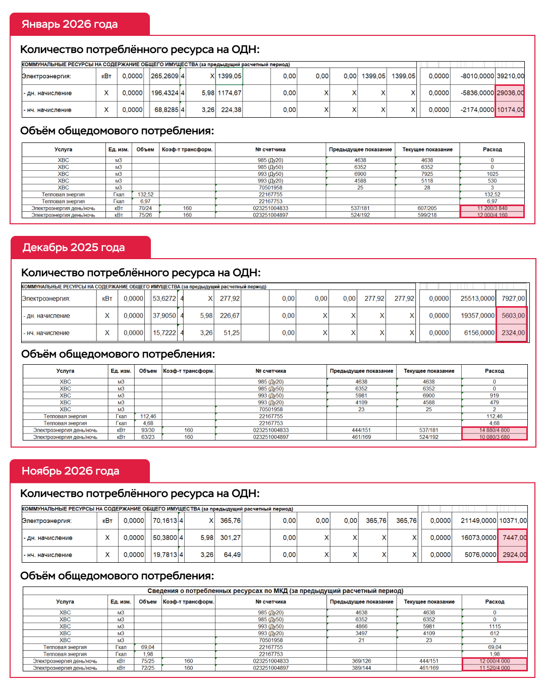 Ключевой момент: общедомовое потребление электроэнергии при этом не выросло. Это подтверждает расход, зафиксированный на основании показаний ОДПУ: