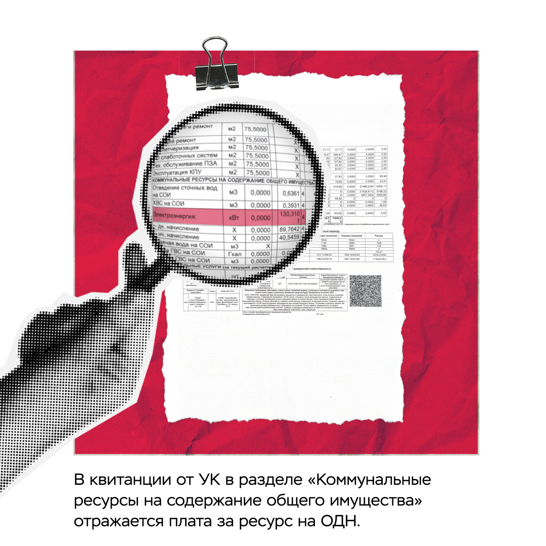 В квитанции от управляющей компании отражаются начисления за ресурсы, потраченные на общедомовые нужды — например, на освещение подъездов и придомовой территории, работу лифтов и насосов, полив зеленых насаждений и мытьё этажей, отопление мест общего пользования. Плата за ресурсы на общедомовые нужды — это сложные расчёты, для которых используются формулы, описанные в Постановлении Правительства Российской Федерации № 354.